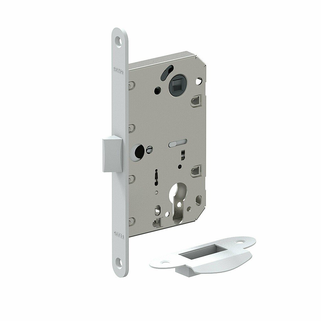 Описание: Цилиндровый врезной универсальный замок из стали с язычком из ударопрочного пластика предназначен для установки на межкомнатные двери с запиранием на ключ (ключ/фиксатор).